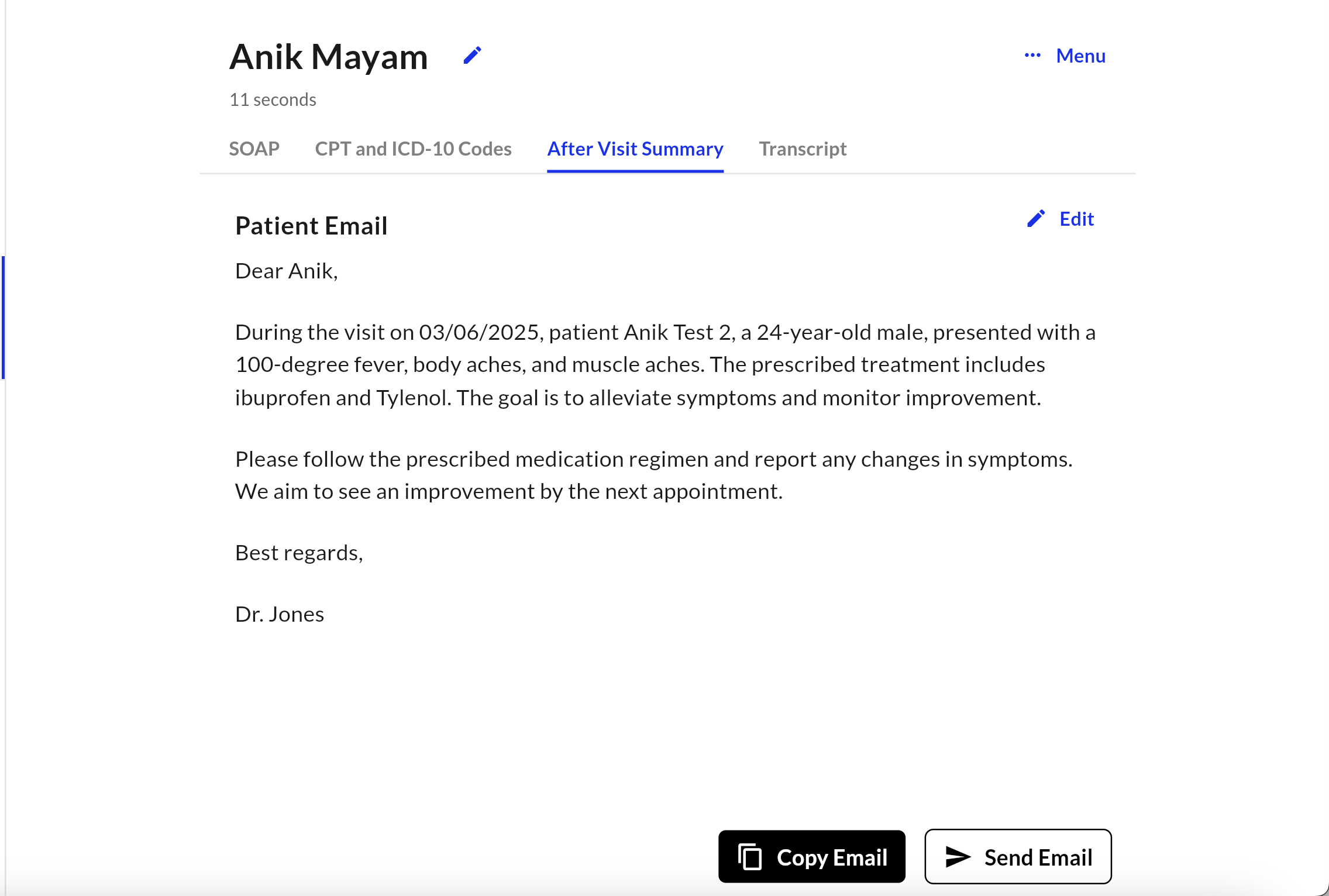- Click Send Email opening a popup for you to view, edit, and email the summary directly to your patient