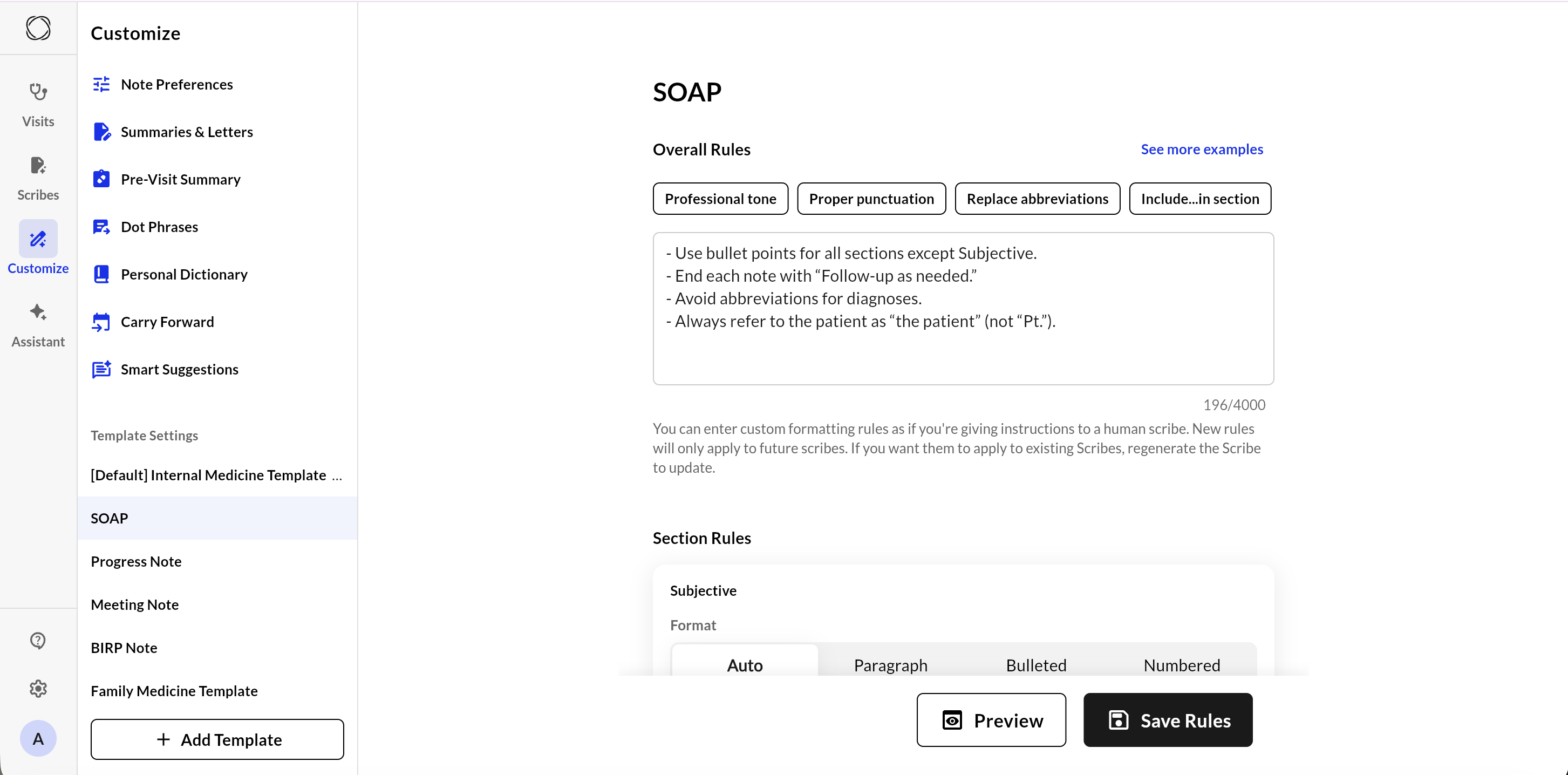 Custom formatting applies note-by-note instructions to the AI, as if you were guiding a human scribe. These rules impact how the note is structured, phrased, and presented. For example, you can instruct the system to:- Bold all section headers