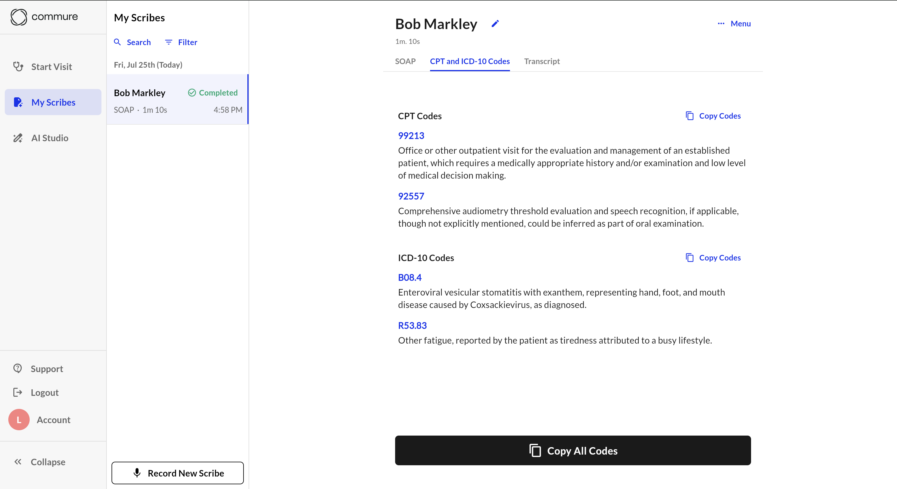 Commure Ambients can generate a list of CPT and ICD-10 codes based on what was discussed.