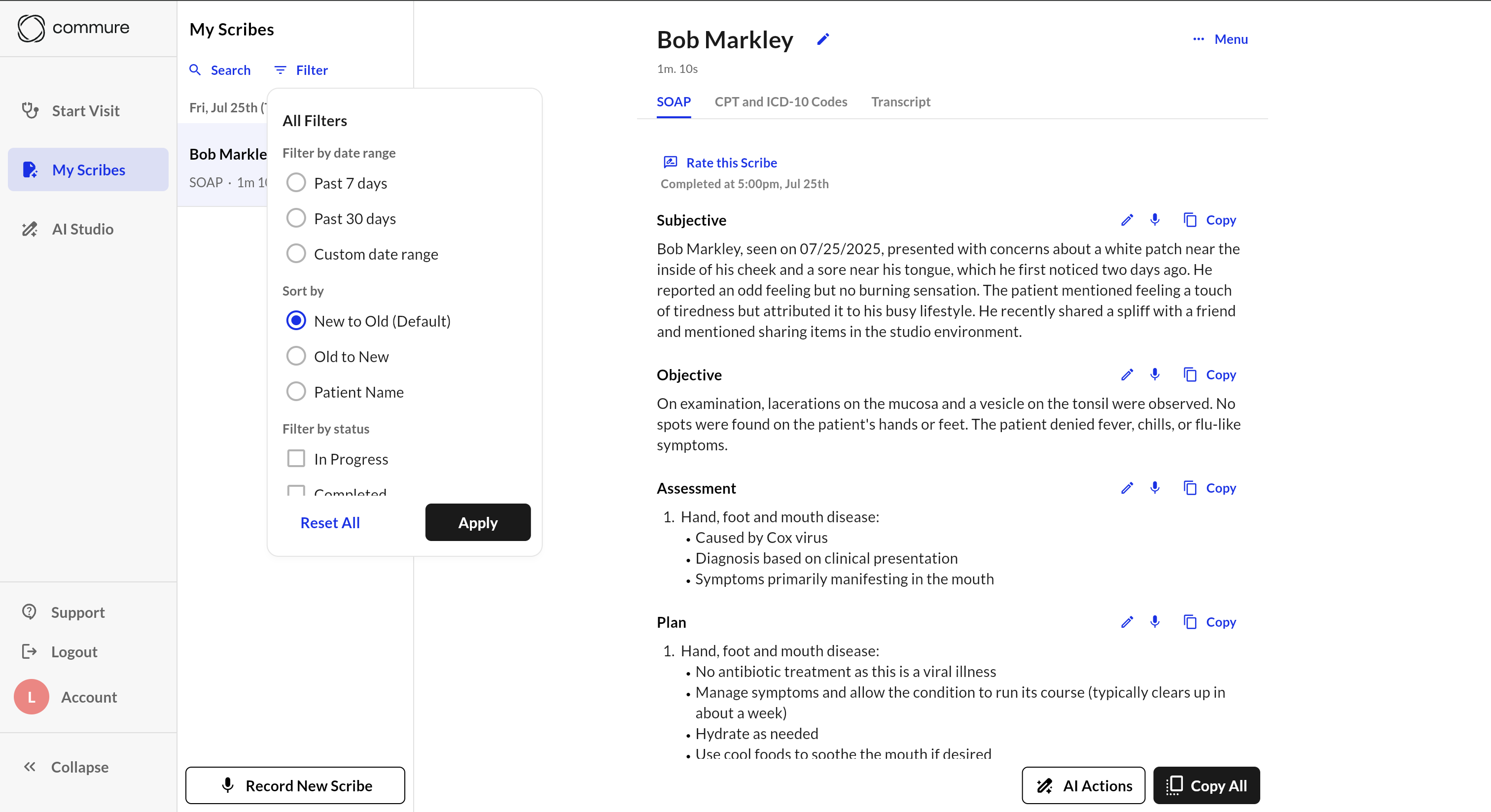 - Copy Transcript Click “Copy Transcript” to copy the entire transcript for external reference, EMR documentation, or follow-up.