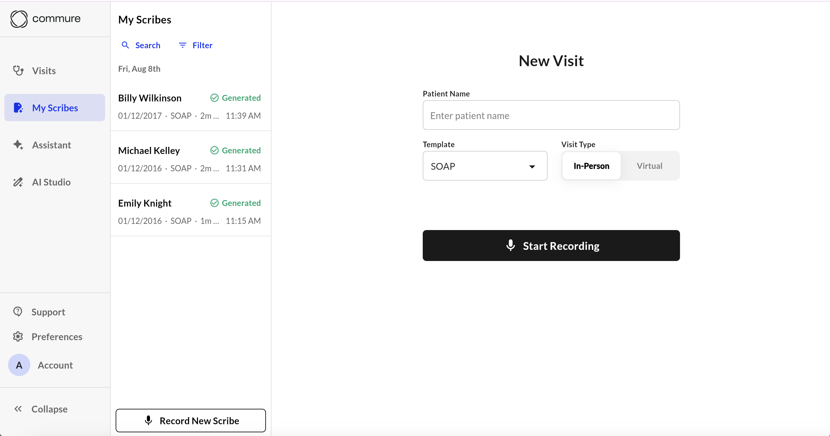 After logging into ambient.commure.com, you will land on the Visits page by default. If you navigate away, you can always return via the ‘My Visits’ tab in the side navigation.- To start a new recording, navigate to ‘New Visit.’
