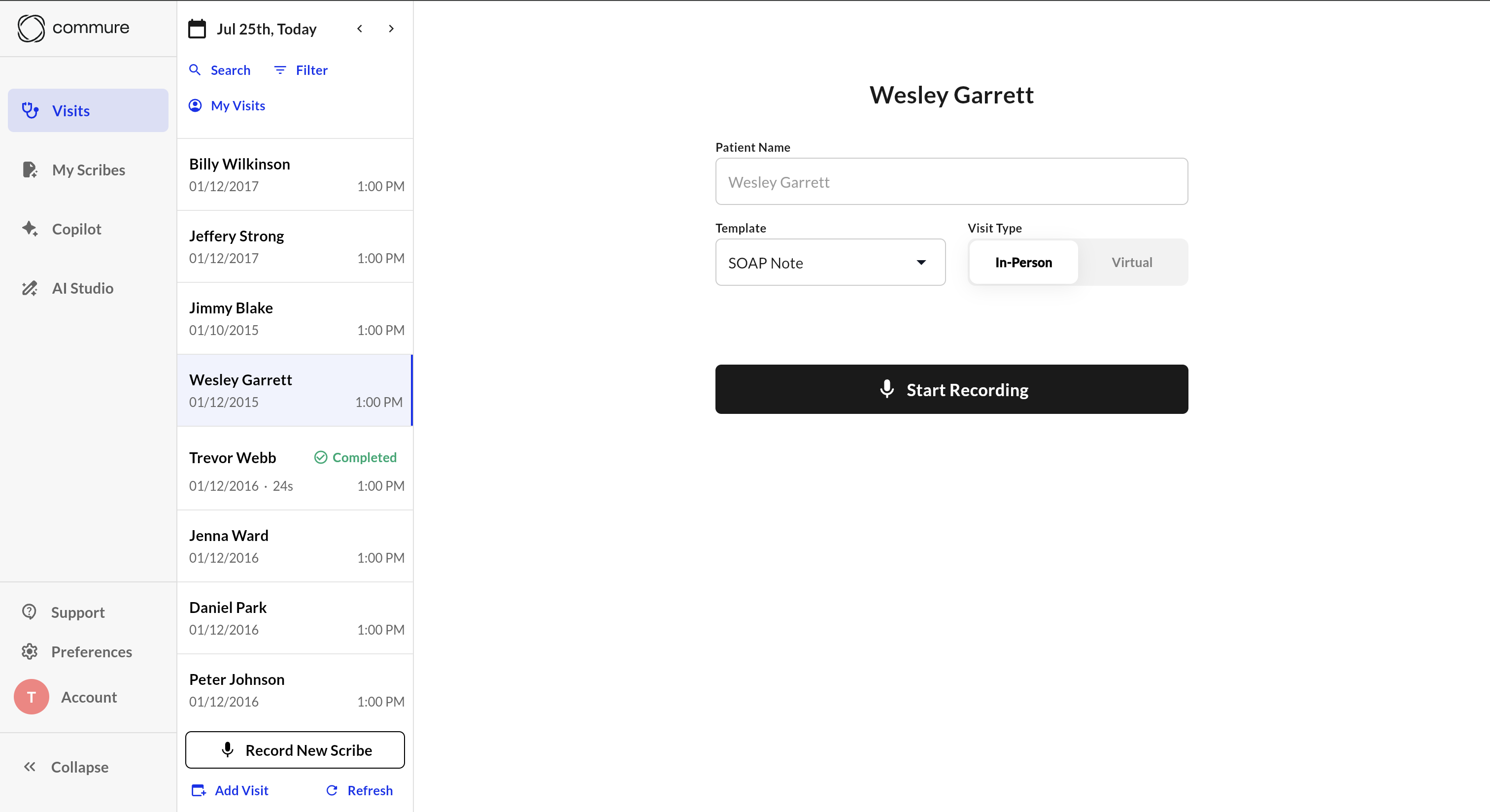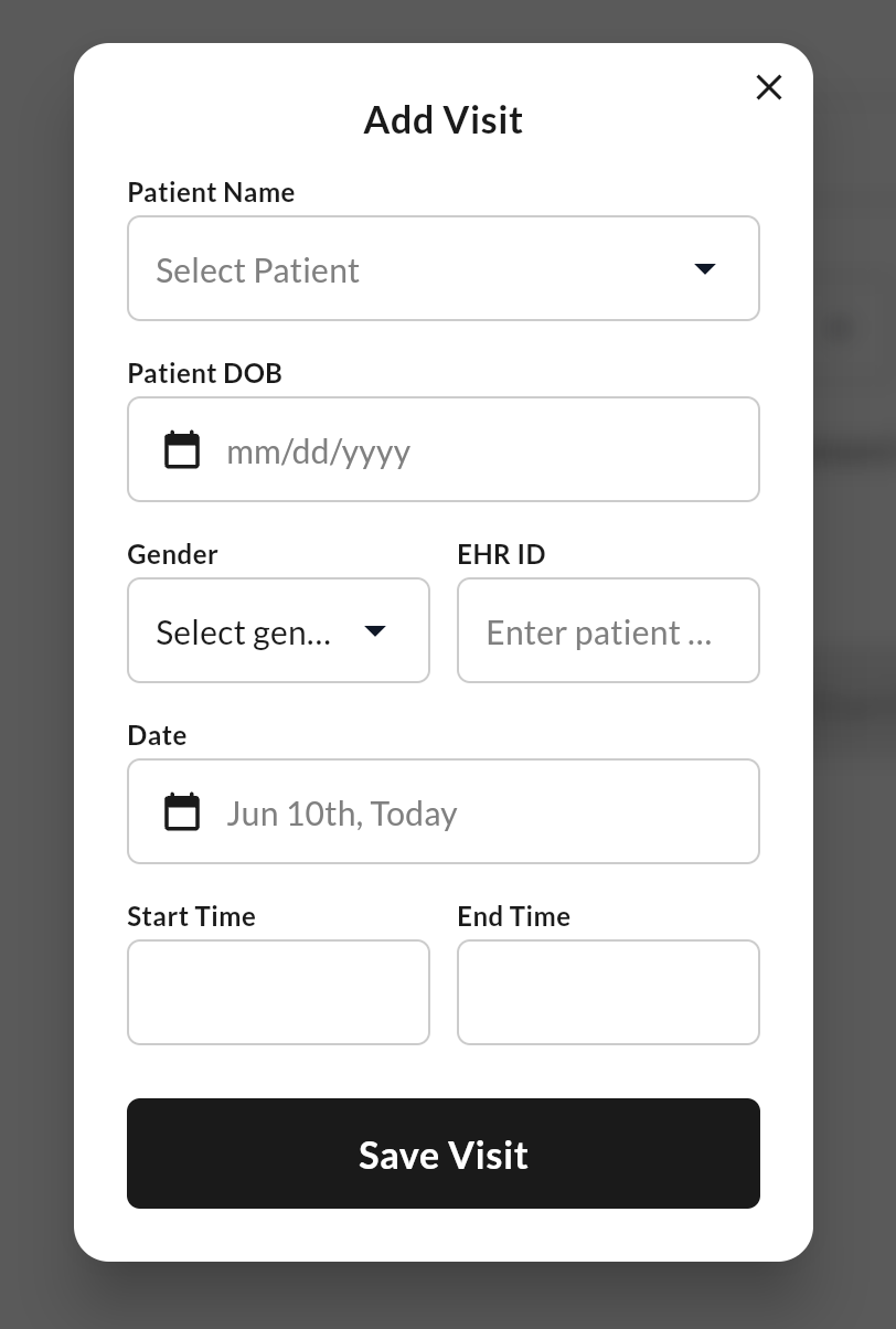 The Visits tab allows integrated users to view, manage, and record scribe notes based on patient appointments pulled directly from their EMR. You can also manually create visits if needed.